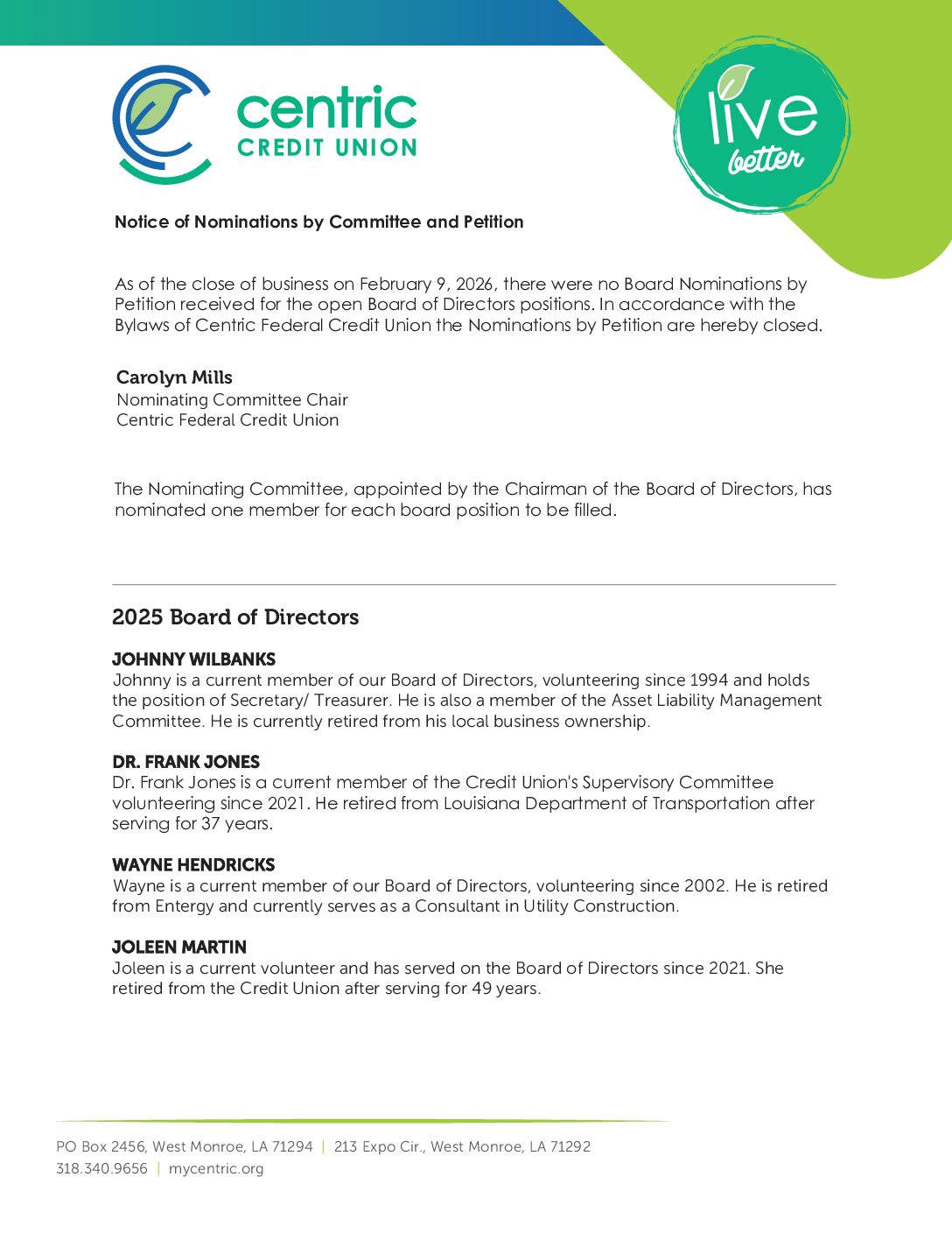 The Annual Meeting of Centric Federal Credit Union will be held at the West Monroe Convention Center, on March 20, 2025, West Monroe, Louisiana at 6:00 P.M. We hope you will attend the Annual Meeting and Election.